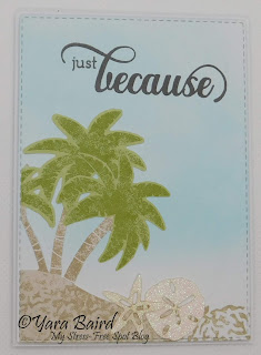 This is my alternative kit on the a little smile kit June 2019 kit and went in my box to Gray Matters Foundation. I used tumbled glass ink with life changing blender brush by Picket Fence Studios then stamped the "sand" from the kit set with crumb cake then attached the palm piece and die cut my layer with rectangle stitched framelits die, then stamped my message from fancy greeting set by Altenew with VersaFine Clair fallen leaves and attached the star shell and coin shell from kit